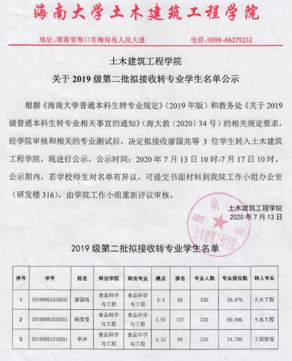 伟德国际bevictor1946关于2019级第二批拟接收转专业员工名单公示