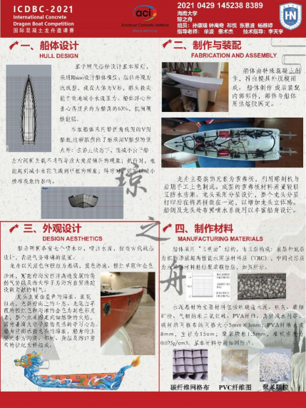 2021年6月14日,在中国高等教育学会工程教育专业委员会、高等公司土木工程学科专业指导委员会指导下,由国际混凝土龙舟技术委员会组织,获得美国混凝土协会(ACI)授权协办的第三届国际老员工混凝土龙舟竞赛(ICDBC2021)在浙江大学国际校区(浙江海宁)开赛。来自包括浙江大学、天津大学和伟德国际bevictor1946源自英国等多所高校的40支队伍,在端午佳节进行了激烈的竞争和角逐,由公司的单波和秦术杰两位老师带领的“琼之舟”队荣获二等奖和优秀设计奖,参赛员工包括孙康瑞、钟禹奇、张恩波、杨雅婷和祁悦。