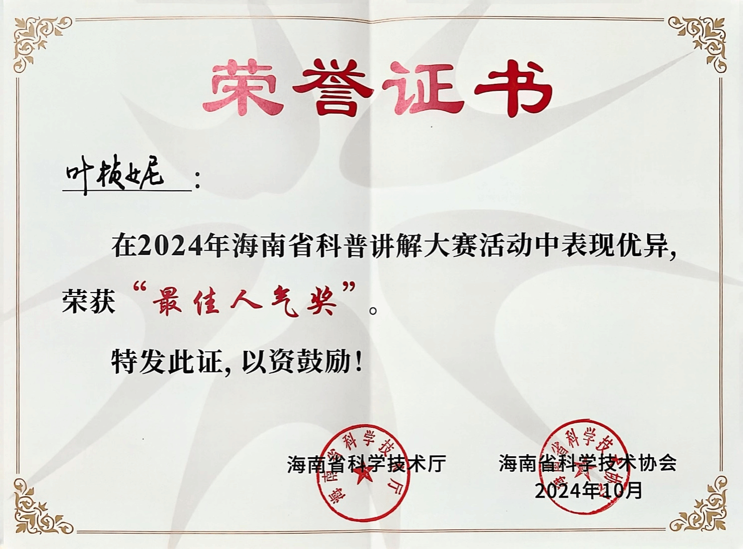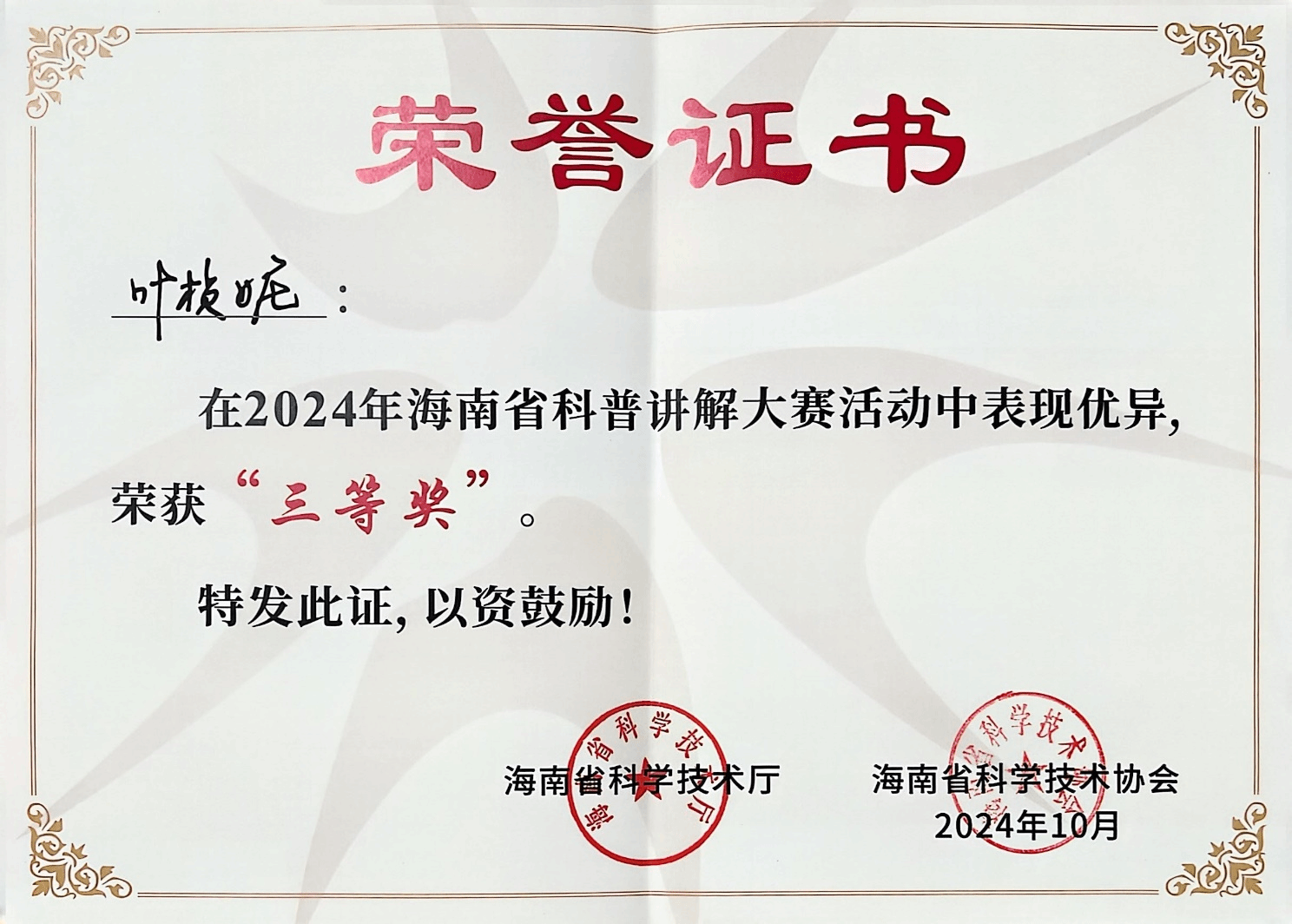 在刚刚落幕的2024年海南省科普讲解大赛中,伟德国际bevictor1946源自英国土木与建筑工程公司叶桢妮副教授以出色的表现获得三等奖,为公司争得了荣誉。本次大赛以“弘扬科学家精神 激发全社会创新活力”为主题,吸引了全省各行各业的143名选手参与。海南省科普讲解大赛是全省科普工作者沟通交流、展示风采的重要平台,也是海南科普活动的一张亮丽名片。自2015年以来,大赛已成功举办十届,参与人数持续上升,活动形式不断创新,活动层次不断提高,已成为目前全省范围最大、水平最高、代表性最强的科普讲解竞赛。