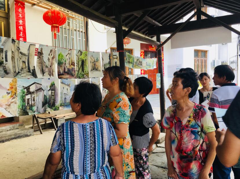 建筑学带队老师和员工们展出了自己在上晓起村写生的水彩作品,展览期间,村民和游客纷纷驻足欣赏,对此次画展赞不绝口。有的村民说:“这幅画画的是我家大门,画的真像。”有的村民说:“住在村子里几十年了,看到周围都麻木了,看了你们的画,才发现我们的村子那么漂亮,以后每看到一个地方,都会想到你们的画。”村民们虽语言朴实,但道出了他们的欣喜。