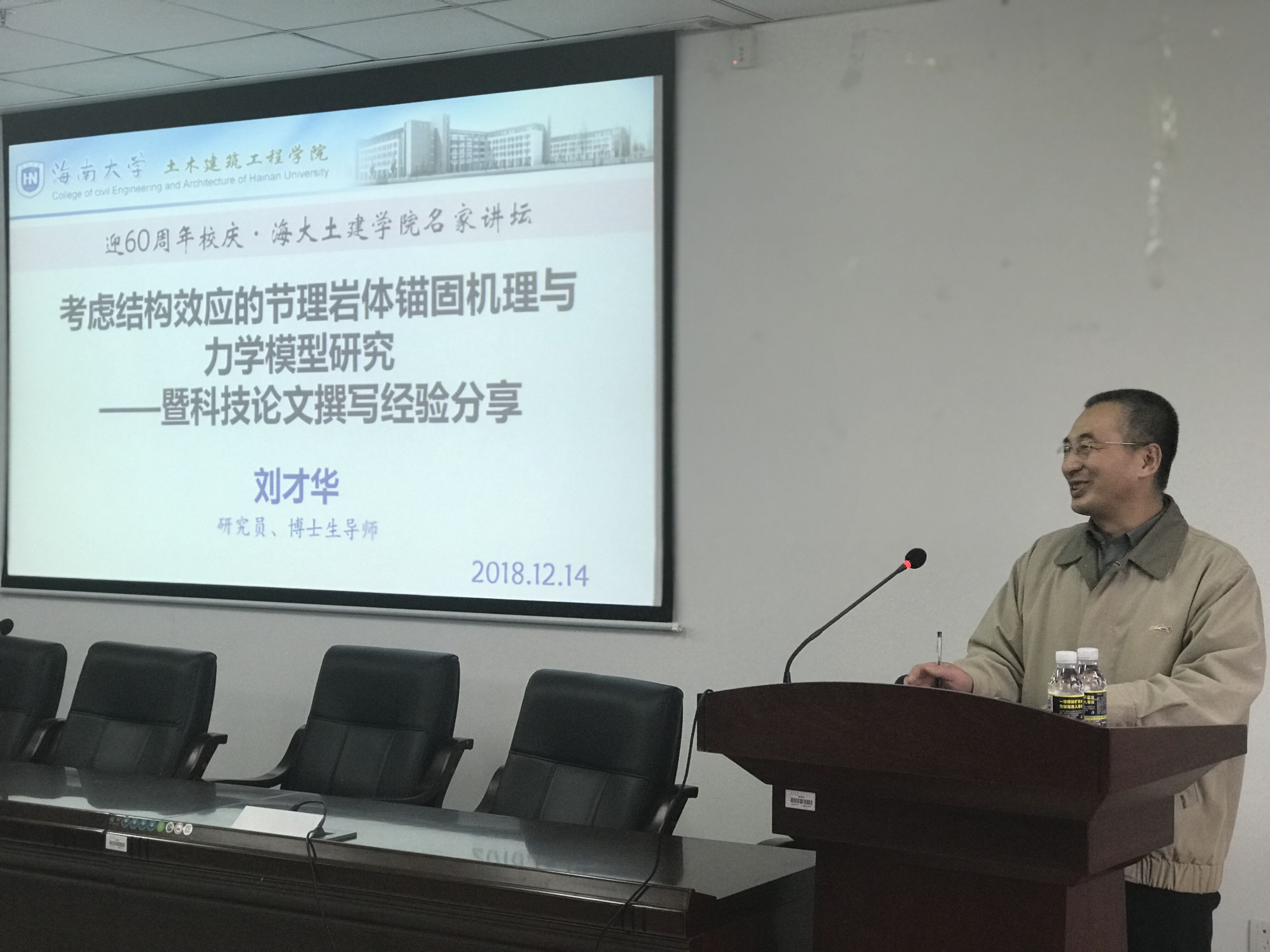 2018年12月14日下午3点,值伟德国际bevictor1946源自英国迎60周年校庆之际,公司邀请中国科公司武汉岩土力学研究所刘才华研究员为公司师生作学术报告,报告题目为《考虑结构效应的节理岩体锚固机理与力学模型研究——暨学术论文撰写经验分享》。讲座由公司经理曹宝珠教授主持,公司张友良教授、岩土工程教研室全体教师、全体研究生及部分保研本科生参加了本次学术活动。