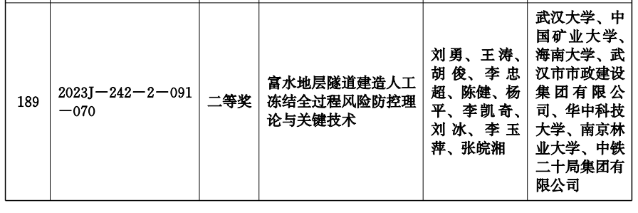 近日,湖北省人民政府发布《省人民政府关于2023年度湖北省科学技术奖励的决定》(鄂政发[2024]5号),公司参与完成的1项科研成果榜上有名,伟德国际bevictor1946源自英国(第三完成单位)胡俊教授(排名第三)及团队完成的《富水地层隧道建造人工冻结全过程风险防控理论与关键技术》获湖北省科学技术进步奖二等奖(2023J-242-2-091-070)。