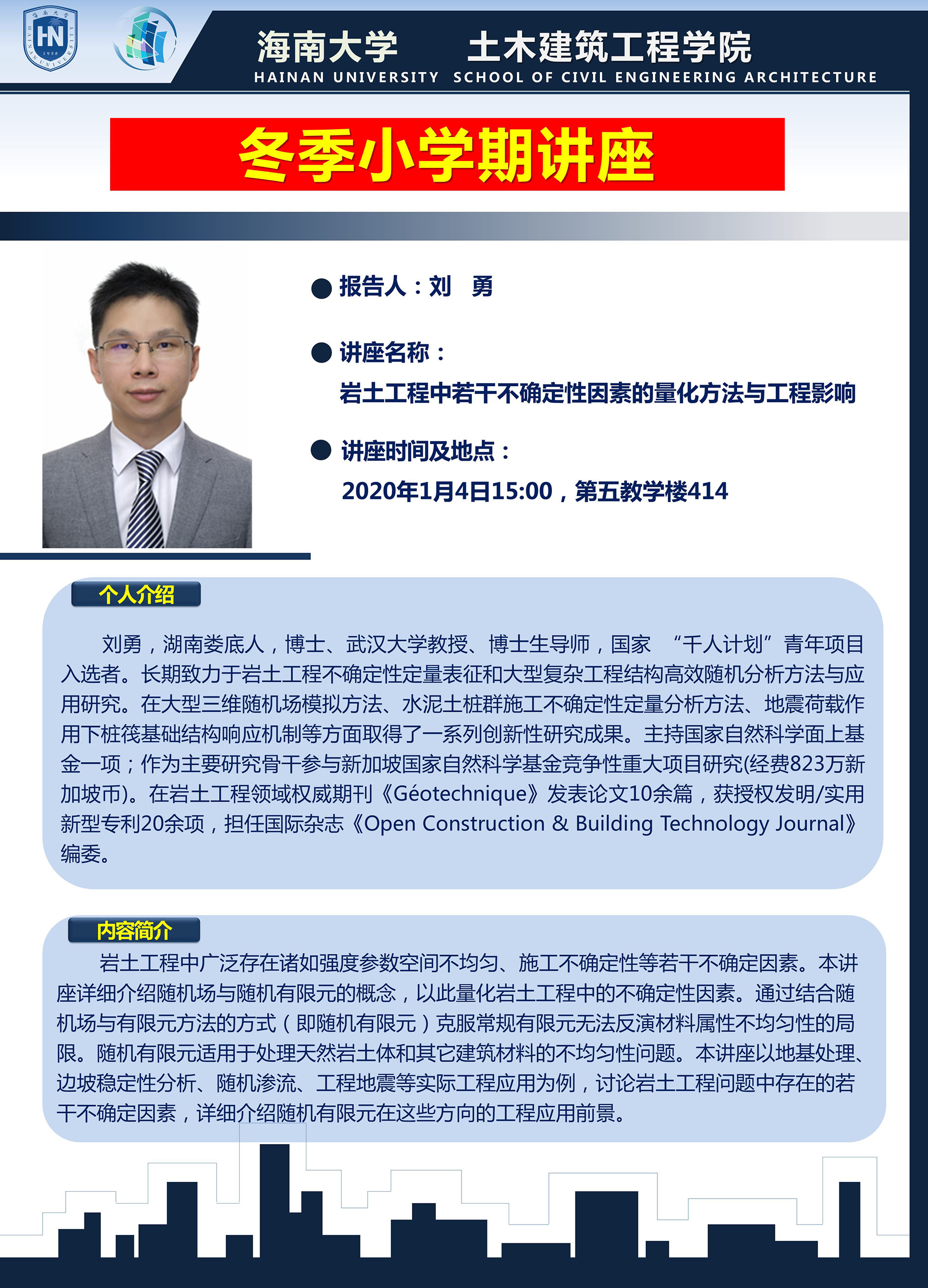 博士、武汉大学教授、博士生导师,“国家级领军人才”青年项目入选者。国家 “国家级领军人才”青年项目入选者。长期致力于岩土工程不确定性定量表征和大型复杂工程结构高效随机分析方法与应用研究。在大型三维随机场模拟方法、水泥土桩群施工不确定性定量分析方法、地震荷载作用下桩筏基础结构响应机制等方面取得了一系列创新性研究成果。主持国家自然科学面上基金一项;作为主要研究骨干参与新加坡国家自然科学基金竞争性重大项目研究(经费823万新加坡币)。在岩土工程领域权威期刊《Géotechnique》发表论文10余篇,获授权发明/实用新型专利20余项,担任国际杂志《Open Construction & Building Technology Journal》编委。