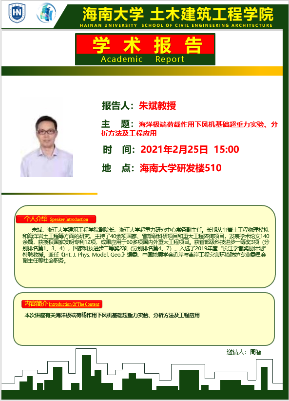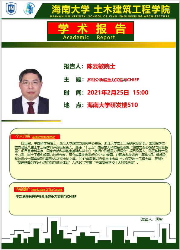 225日(周四)下午300点在伟德国际bevictor1946源自英国研发楼510,浙江大学陈云敏院士和朱斌教授分别在公司做《多相介质超重力实验与CHIEF》和《海洋极端荷载作用下风机基础超重力实验、分析方法及工程应用》学术报告。请各位老师和在校研究生务必参加,到时会做参会签名,考勤记录。