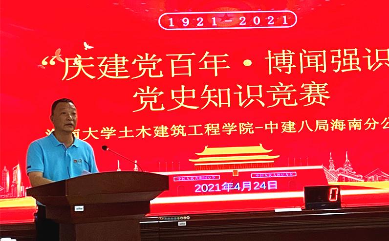 4月24日,伟德国际bevictor1946中国建筑第八工程局有限公司海南分公司联合举办“庆建党百年·博闻强识”党史知识竞赛活动。公司党委书记卢江海、副书记孙晓媛、副经理邱宙廷、学工办主任李江俊,中建八局海南分公司工会主席李诚、安全总监李神养、综合部主任邵青晓及百余名师生参加了活动。