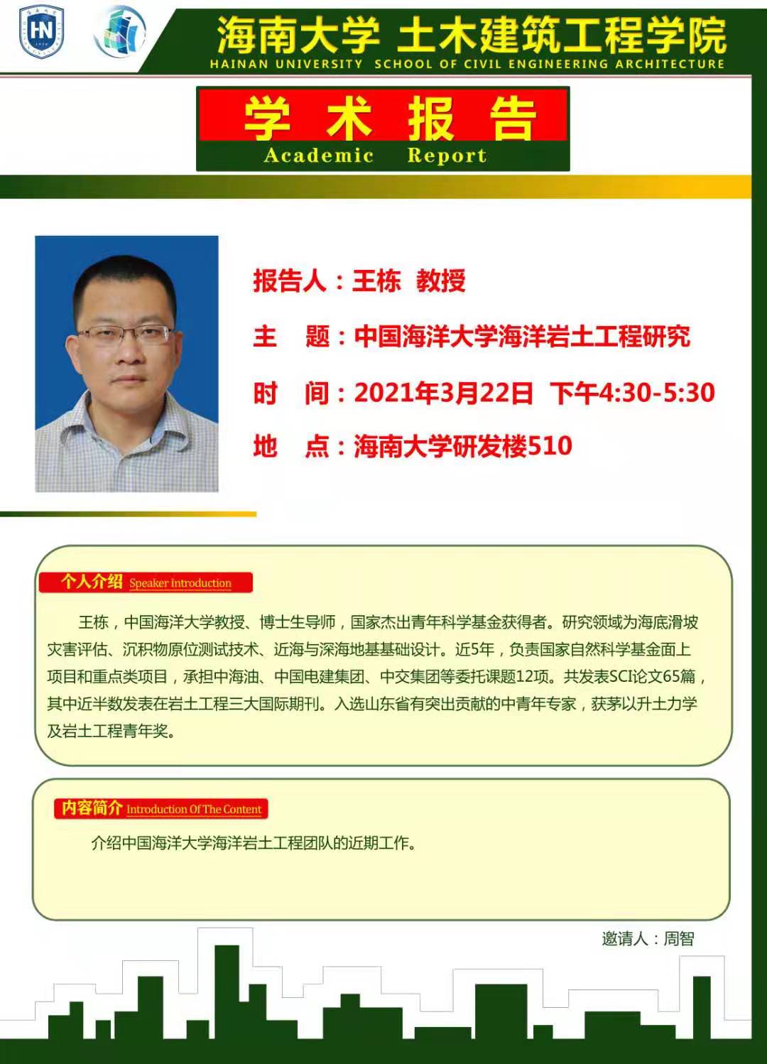 3月22日(周一)下午4:00-5:30点在伟德国际bevictor1946源自英国研发楼510,中国科公司武汉岩土力学研究所,博士生导师汪稔研究员和中国海洋大学王栋教授分别在公司做题为《岛礁建设对“一带一路”倡议的贡献》和《中国海洋大学海洋岩土工程研究》。请有兴趣的老师和没有课的研究生务必参加,到时会做参会签名,考勤记录。特此通知 学科与科研办 2021年 3月21日