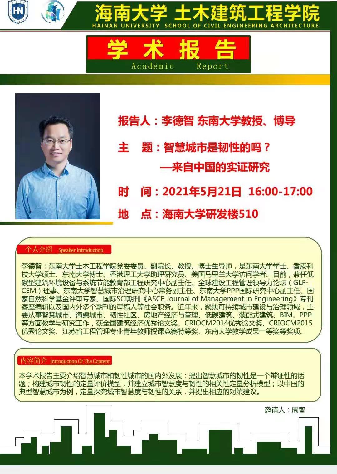 5月21日(周五)16:00-17:00点在伟德国际bevictor1946源自英国研发楼510,东南大学土木工程公司副经理、博士生导师李德智教授在公司做题为《智慧城市是韧性的吗? —来自中国的实证研究》学术报告。欢迎有兴趣的老师和没有课的研究生参加。特此通知